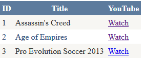 Just build your website and open it with your favorite browser. The result will be this. You can click at the watch link of every record, this should open a new window which will point to the YouTube’s video url. Enjoy!