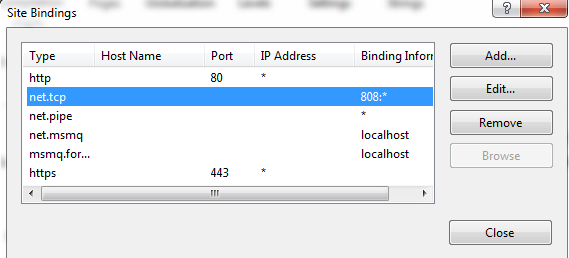 1. Note – be careful up whitespace in the “Enabled Protocols” in IIS. If there is whitespace between them, I have found it to fail. In your example, you specify “http, net.tcp”. It should be, “http,net.tcp”
