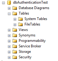 Right click the Service.svc file, select View in Browser and make sure the service is running. That was the first step. The next step, is to create a database which the service will use to authenticate clients through the ASP.NET Provider. In order for the ASP.NET Provider to use such a database, that database must have some basic tables such as “Users” or “Roles”. To do that, as soon as we create the new database, we are going to install the services that the ASP.NET Provider requires. Then, in the Web.config file, will make the right configurations to tell the Provider to use that database to validate users. I am going to create a new db in my SQL Server 2012. I will call it dbAuthenticationTest. As you can see, it is just an empty database: