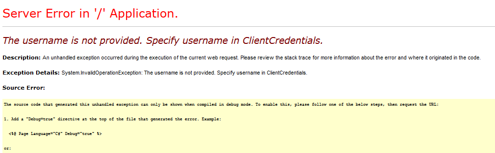 Go ahead and modify the Default.aspx.cs file as follows, providing this time User credentials.