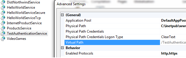 After publishing the at the https://localhost/TestAuthenticationService/ IIS address the website, click it from the IIS Manager, select Advance Settings and enable the https protocol:
