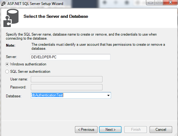 <add name="dbAuthentication" connectionString="Data Source=developer-PC;Initial Catalog=dbAuthenticationTest;Integrated Security=True" providerName="System.Data.SqlClient" />
