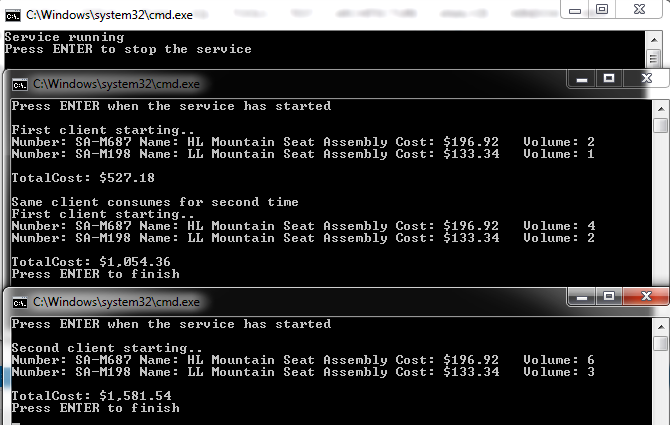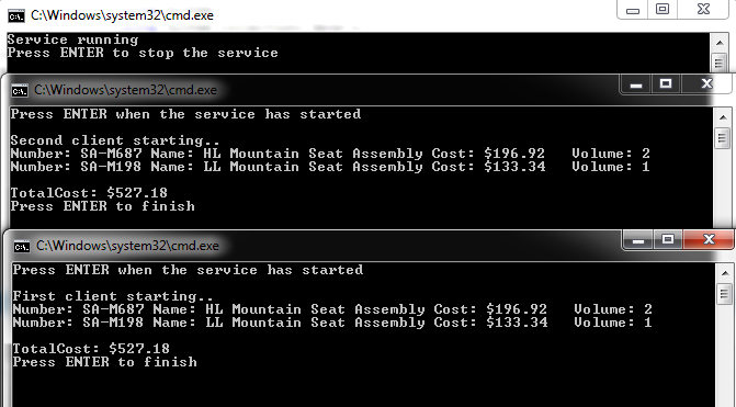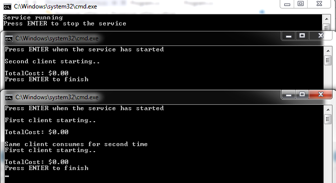 Right click the solution and Set ShoppingCartHost, ShoppingCartClient, ShoppingCartNewClient as Start projects. Before running them, in order to know which client is who, add in the two clients projects Program.cs file, some code that displays that information.