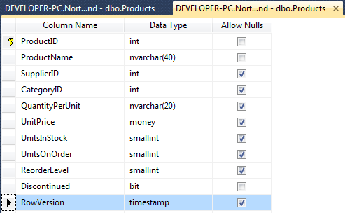 Notice the last property “RowVersion”. We will use that property later to indicate whether a record has been modified since it was last retrieved. We will have to add an extra column of type “timestamp” in the Northwind’s Product table to support that functionality. In the next step we are going to create the data access service layer but first we need to make sure our database is ready. Go, download the “Northwind” sample database (it’s free) and attach it to your SQL Server. Open the Product table and add a new column named “RowVersion” of type “timestamp”.