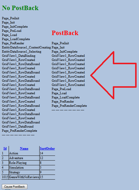 The RowCreated and RowDataBound events are repeated once for each Genre record (6) plus two for header and footer records. When the Page loads for first time and after the Page_LoadComplete and Page_PreRender events, the GridView control sees that is hooked up to an Entity DataSource control and asks it to retrieve the respective data. This causes the ContextCreating and Selecting events to be triggered and as soon as the GridView receives data from the Entity DataSource, the DataBinding event fires. For each item in the datasource, the RowCreated and RowDataBound events are triggered. When all data are bound the DataBound event occurs. On the other hand, when PostBack occurs, you don’t see either any RowDataBound, DataBound or Entity’s DataSource events. This is because the GridView control is able to reconstruct the entire control from the ViewState field. Add also the WriteMessage method in the Button event handler. Also try to sort the table by clicking a header text in the GridView.