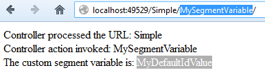 Notice the {id} segment we added and it’s default value “CustomSegmentId” as well. You can access any of the segment variables in the action methods, through the RouteData.Values property. To demonstrate this, first add a new action method in the SimpleController: