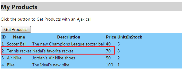 We have bound the “btnAjax” button’s click event to an Ajax call. This call targets the Home controller’s GetProducts action (url parameter). If the call is successful we simply place the returned html into the “products” div. So simple. Run your application and click the button.