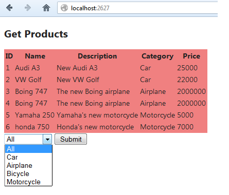 Change your GetProducts View contents as follow. We need to pass a string as the Model this time, since we have changed our respective action method to pass the selected category.