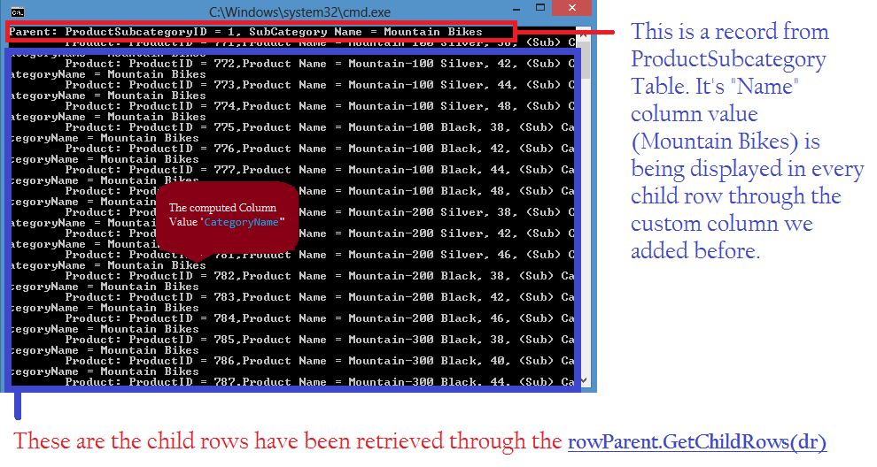 Lot’s of interesting lines here. The sqlSelect string, will retrieve Production.ProductSubcategory and Production.Product Tables from the AdventureWorks database. Lines 11-12 will map the retrieved tables to the respective DataTable names. We do this in order to change the default DataTable names, ADO.NET uses when filling a DataSet. Lines 16-19 create the DataRelation between the two DataTables, through the ProductSubcategoryID common column. Notice that we give a specific name to that DataRelation, ProductSubcategory_Product. We ‘ll use this name later, in order to add a special column to the child DataTable Product. We name this column “CategoryName” and it’s computed value will always be Parent(ProductSubcategory_Product).Name. This tells that it’s value will be equal to a Parent column, named “Name”. The DataRow.GetChildRows(DataRelation dr) will get all child rows of current DataRow object, based on a DataRelation dr. Build and run your application.