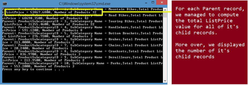 You will notice that we have added only few lines to our code. Lines 30-31 to the Parent DataTable a column named “TotalProductListPrice” with a computed value equal to SUM(Child.ListPrice). This is an aggregate function, that will Sum and return all ListPrice values from it’s child rows. Same story in lines 34-35 where we added a Column named “NumberOfProducts” with a computed value of Count(Child.ListPrice) (I think it’s quite self explainatory what it does..). Also, I have commented out lines that displays child rows, in order to see results more clearly. Build and run your application.
