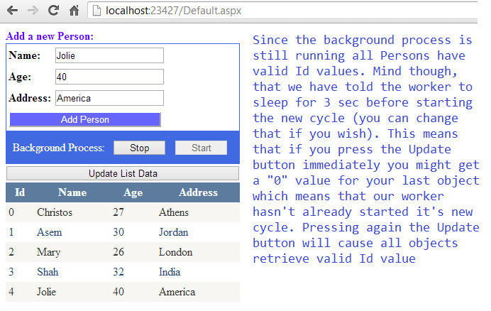 The DoWork function simply put valid Id values for the Person objects exist currently in the personList. Now let’s create the User interface. Add a new Web Form page with a code behind file. Name the page Default.aspx and paste the following code.