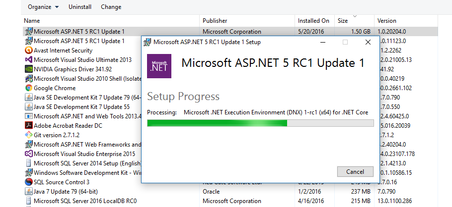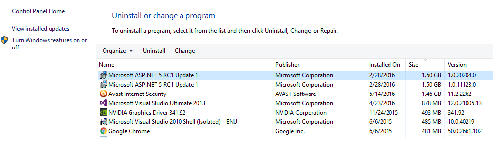 Believe it or not this is where I got the first issue and un-installation failed. I got a setup blocked message for some reason and also asked for a specific .exe file in order for the process to continue. It turned out that the web installer file required was this file so in case you get the same exception download it and select it if asked. At the end of this step you shouldn’t have any version of ASP.NET 5 in the Add/Remove programs panel.