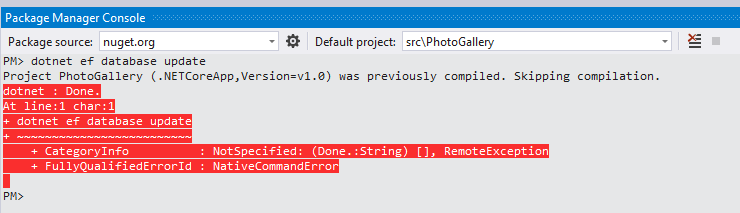IApplicationEnvironment changed to IHostingEnvironment and also the way you add Entity Framework services to the application service provider. You may ask yourself what happens now that Entity Framework migrated to RC2? Do EF migrations work as used to? The answer is yes, there aren’t huge changes in the way you use EF migrations. I encountered though an issue while trying to add migrations so let me point it out. First of all make sure you have all the required dependencies and tools defined in order to use EF migrations. Then open the Package Manager Console and instead of running the old command dnx ef add migrations run the following: