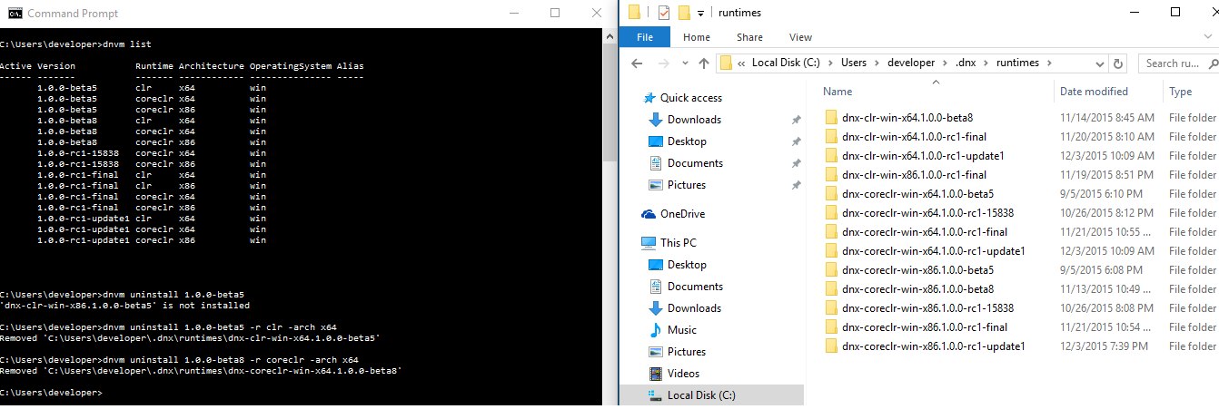 After doing this, if you open a new terminal dnvm will not be recognized by the system. For deleting DNU and DNX delete the %USERPROFILE%\.dnx folder and any reference exists in the PATH environment variable.