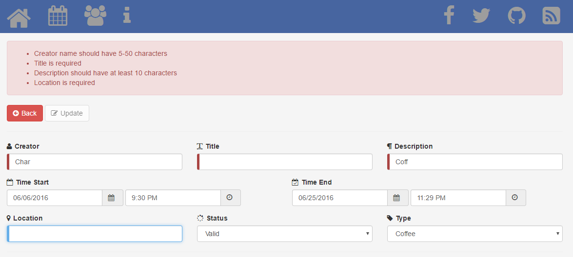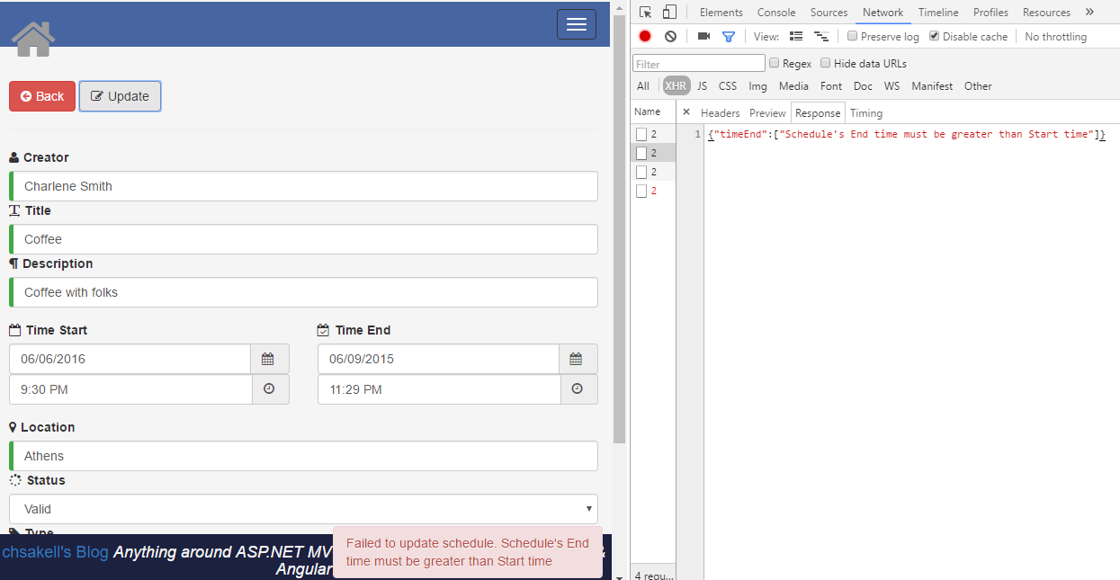 This post is another step by step walkthrough to build Angular 2 SPAs using TypeScript. I said another one, cause we have already seen such a post before. The difference though is that now we have all the knowledge and tools to create more structured, feature-enhanced and production level SPAs and this is what we will do on this post. The Schedule.SPA application that we are going to build will make use of all the previously mentioned components following the recommended Angular style guide as much as possible. As far as the back-end infrastructure (REST API) that our application will make use of, we have already built it in the previous post Building REST APIs using ASP.NET Core and Entity Framework Core. The source code for the API which was built using .NET Core can be found here where you will also find instructions how to run it. The SPA will display schedules and their related information (who created it, attendees, etc..). It will allow the user to manimulate many aspects of each schedule which means that we are going to see CRUD operations in action. Let’s see the in detail all the features that this SPA will incorporate.