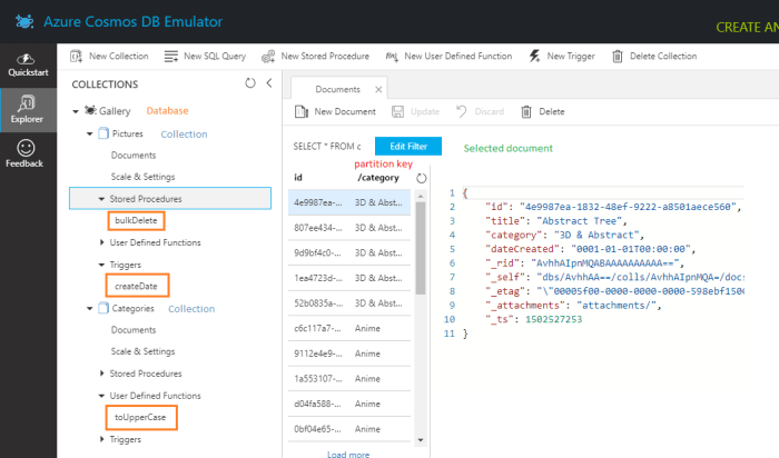 Each picture, has a title and belongs to a category. Now let’s take a look at the emulator’s data explorer.