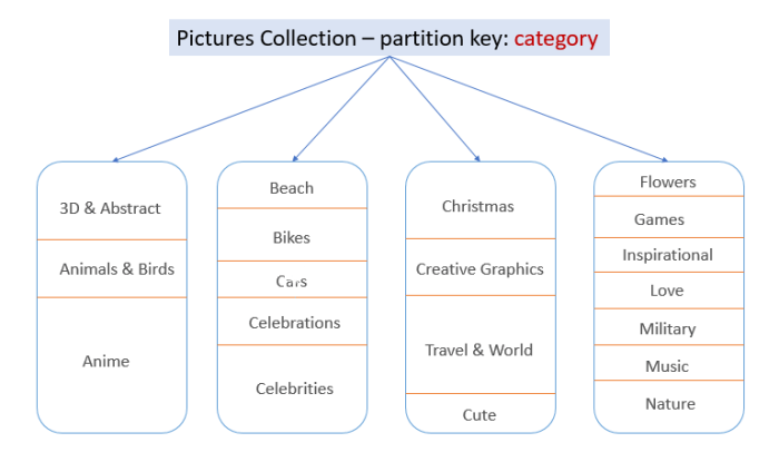 The DatabaseId parameter is the database’s name and will be used for all queries against a database. When creating a database collection you may or may not provide a partitionkey. Partition keys are specified in the form of a JSON path, for example in our case and for the collection Pictures, we specified the partition key /category which represents the property Category in the PictureItem class.