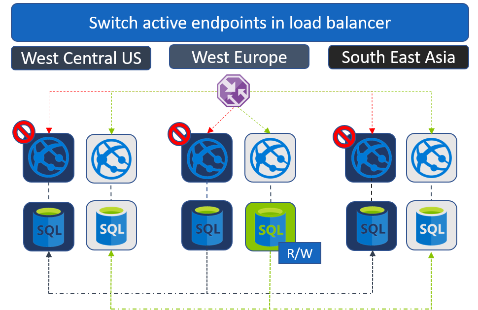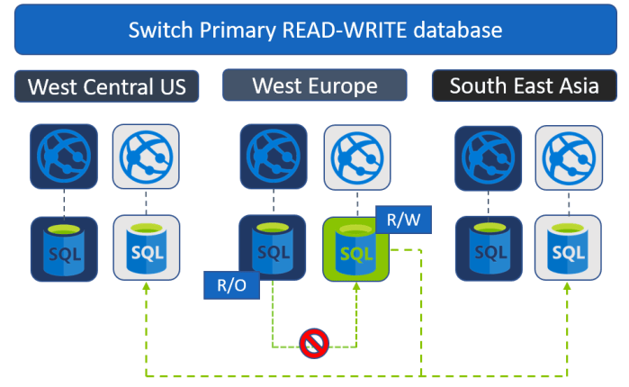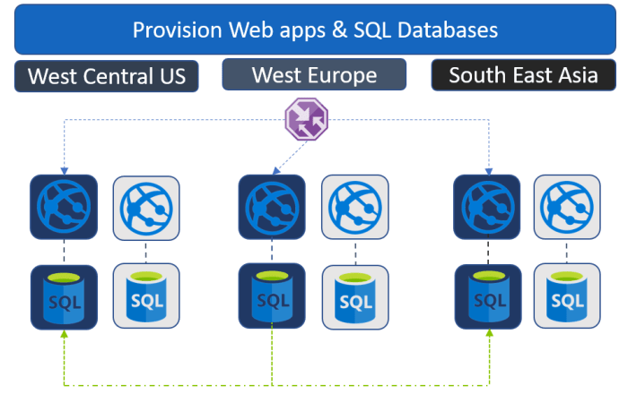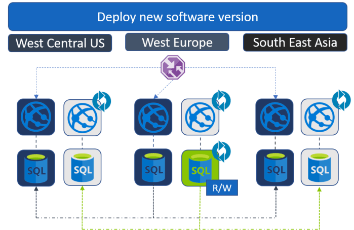 In this step you provision new web apps and SQL server/databases. You provision the same number of web apps and databases that are currently in production. Let’s assume that you have deployed your application in West Europe, West Central US and South East Asia and that the primary READ-WRITE database is in West Europe.