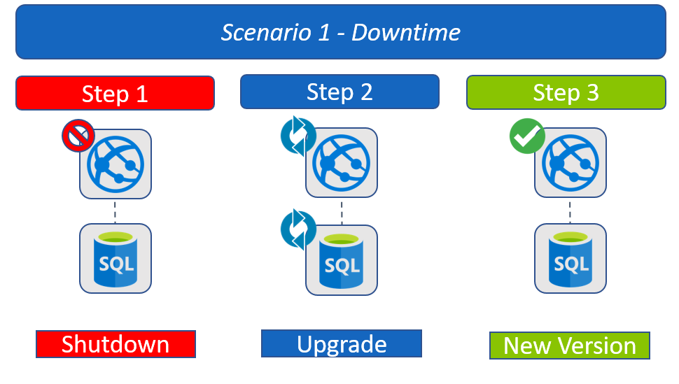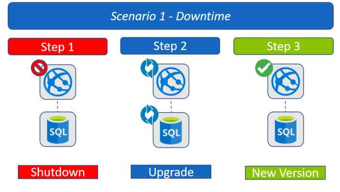 Entirely shutdown the website, display a friendly message to users that the site is under maintenance and finally upgrade code and SQL database. It’s easy, it works but it also has a huge disadvantage: During the release you prevent users from accessing your application which is unacceptable.